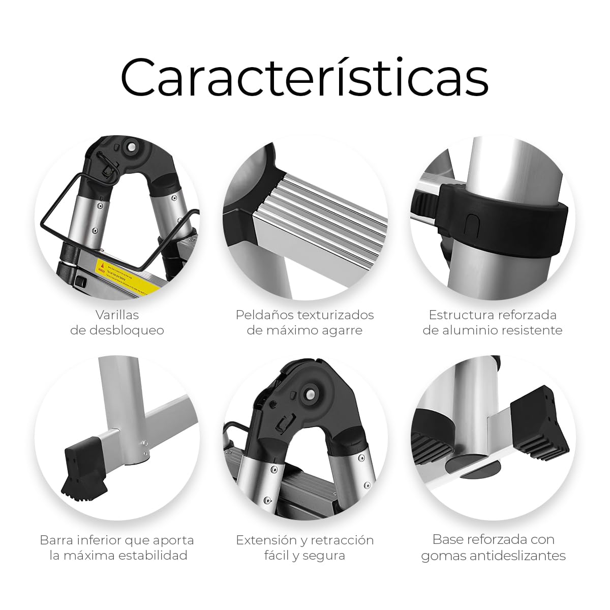 - Escalera Telescópica de Diseño Revolucionario: Altura ajustable entre 81cm hasta 320cm. Soporta hasta 150KG. 10 Estables escalones. Echa de Aluminio Reforzado.