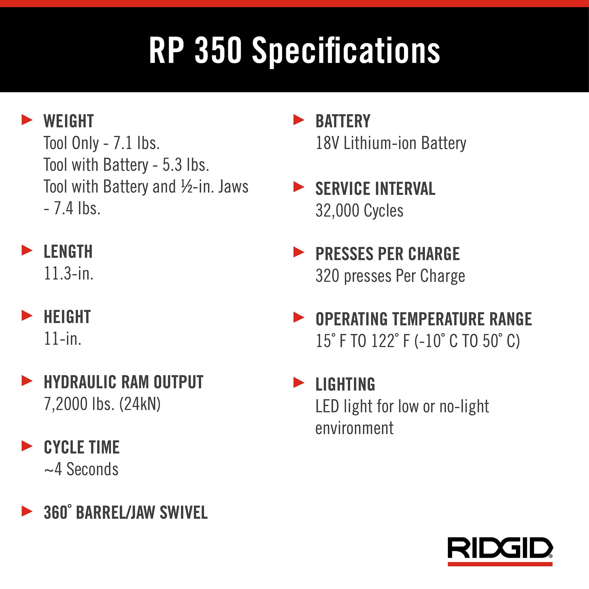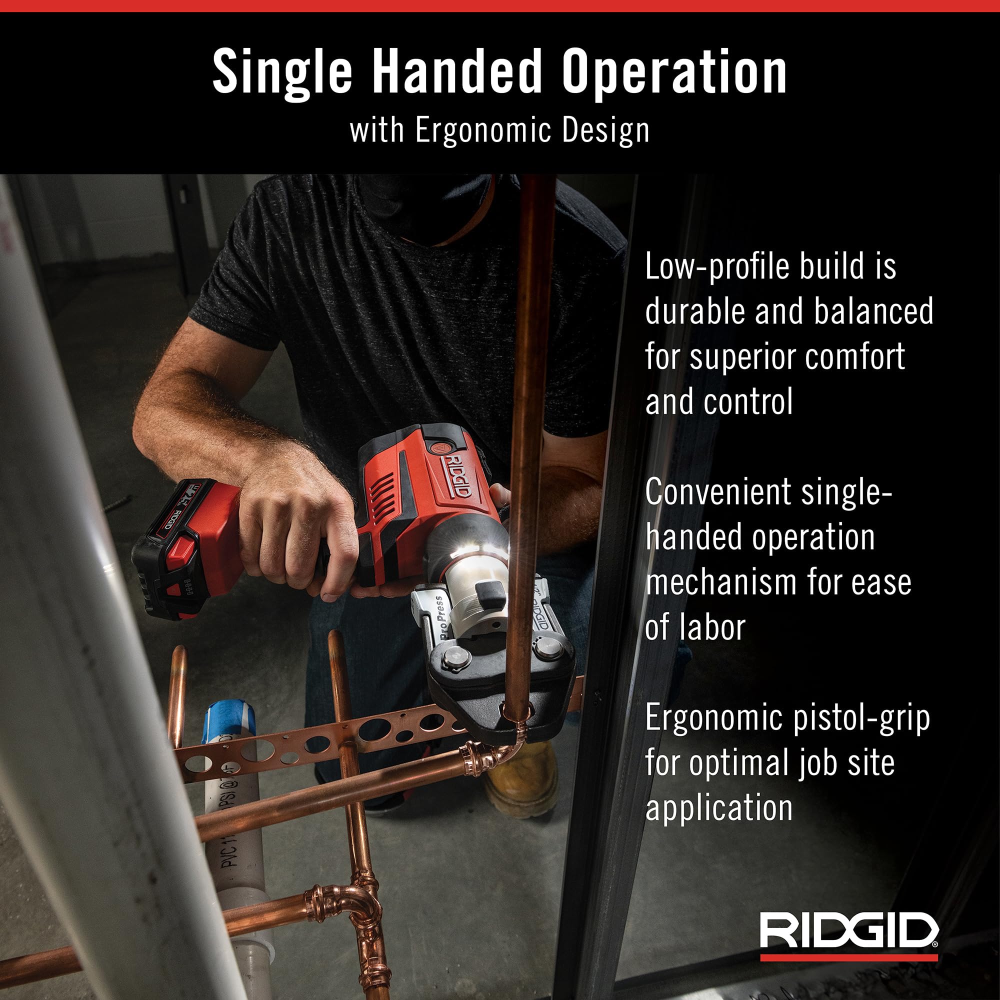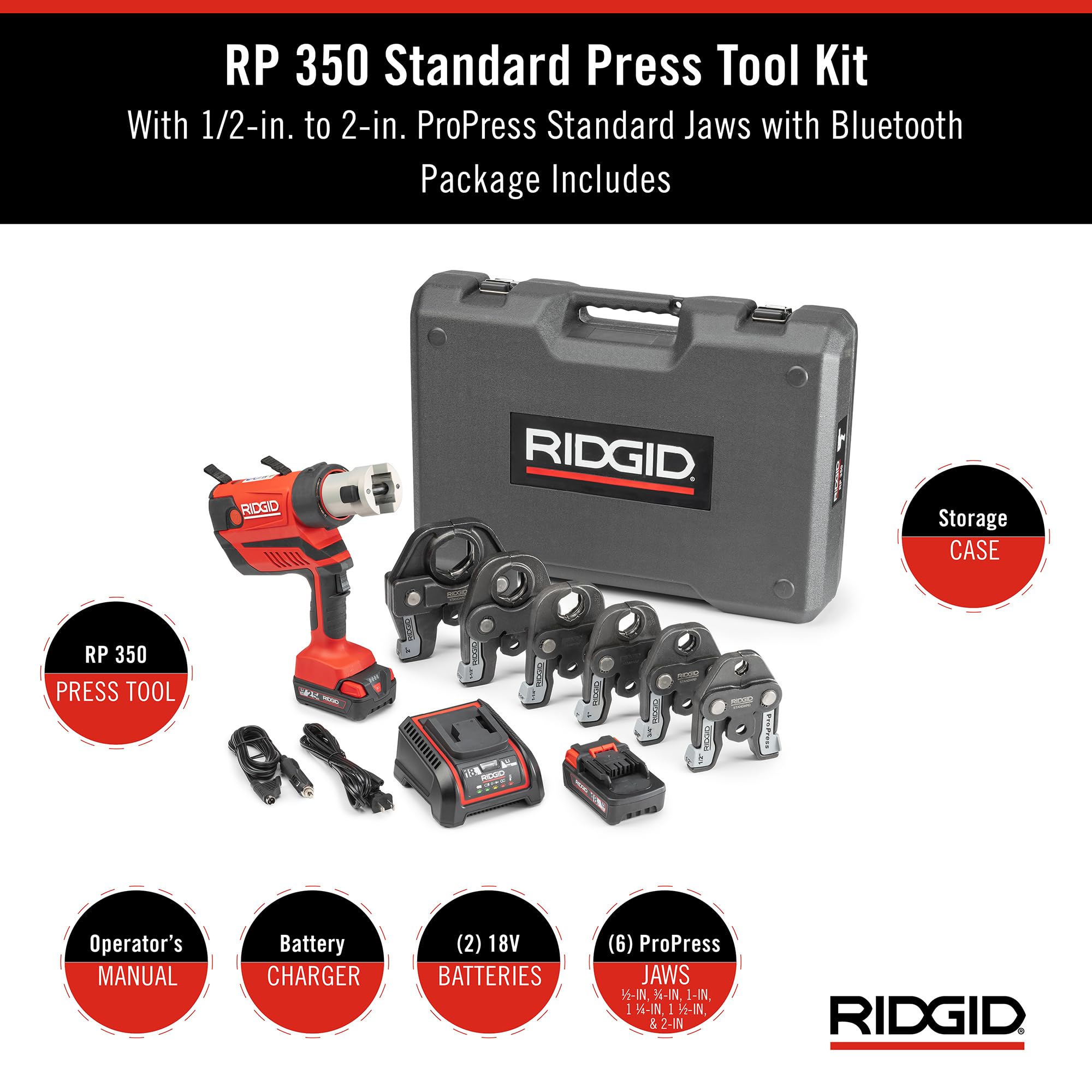 - Herramienta de presión PROPRESS: la única herramienta de prensa compatible con todas las mandíbulas, anillos, actuadores y accesorios de la serie estándar RIDGID ; el kit incluye 4 mordazas ProPress (1/2" a 2"), una batería de 18 voltios, cargador y una funda de transporte resistente