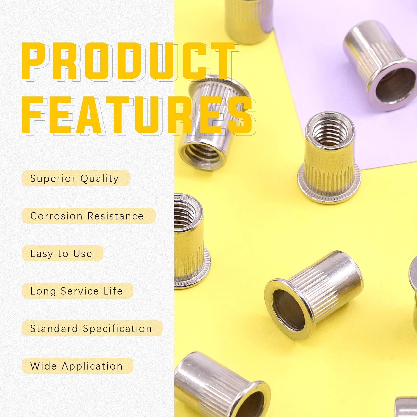 - 4. Diseño práctico: estas tuercas de remache están moleteadas con rosca plana y profunda, que son fáciles de fijar y antideslizantes. Además, apreciarás su apariencia con una superficie uniforme y lisa sin rebabas. El beneficio añadido de no solo ser un cierre confiable, sino que están listos para usar con roscas limpias disponibles para accesorios de tornillo.