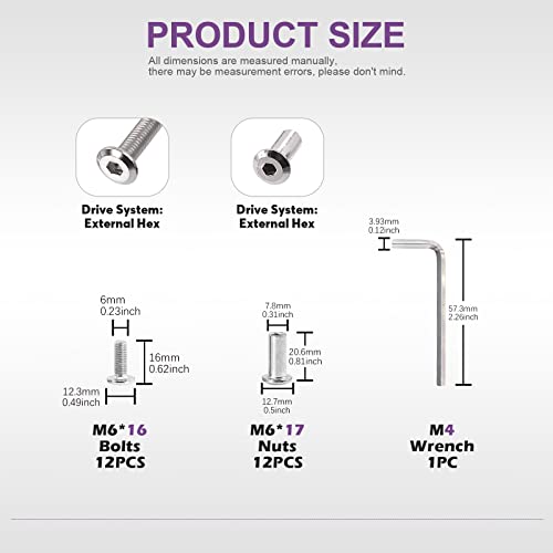 - ✿ 1. Lo que obtienes: en este kit, recibirás 25 pernos hexagonales chapados en níquel plateado con 1 llave Allen, incluyendo M6 x 16 mm; 12 piezas y tuercas M6 x 17: 12 piezas. Ahora tenemos una variedad de tamaños para elegir, puedes elegir lo que necesites, lo que puede satisfacer completamente tus necesidades diarias.
