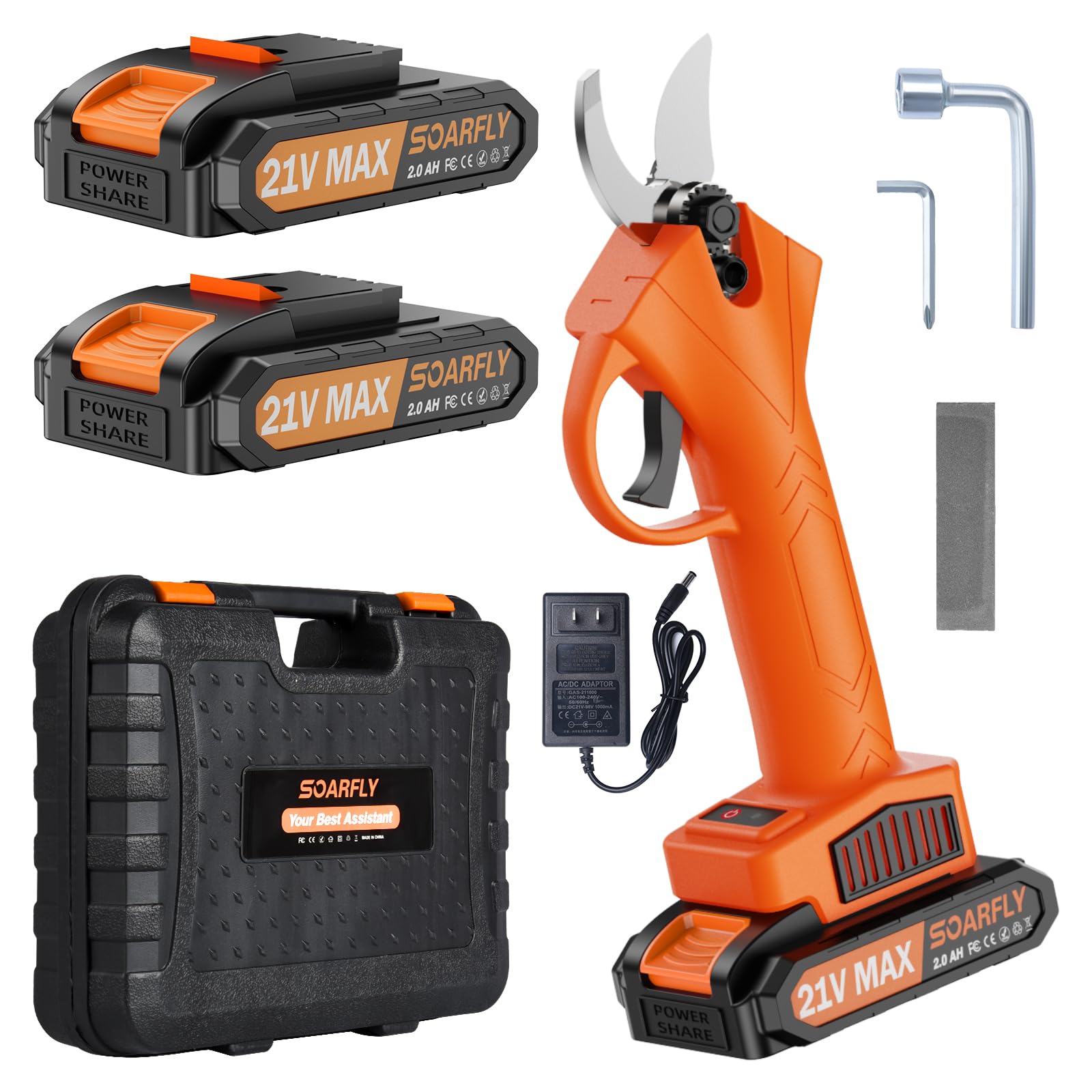 - Kit completo de accesorios: tu compra incluye 2 llaves pequeñas, 1 piedra de afilar, 1 podadora inalámbrica, 2 baterías, 1 adaptador, 1 manual de instrucciones y 1 caja de almacenamiento, un kit completo para todas tus necesidades de poda.