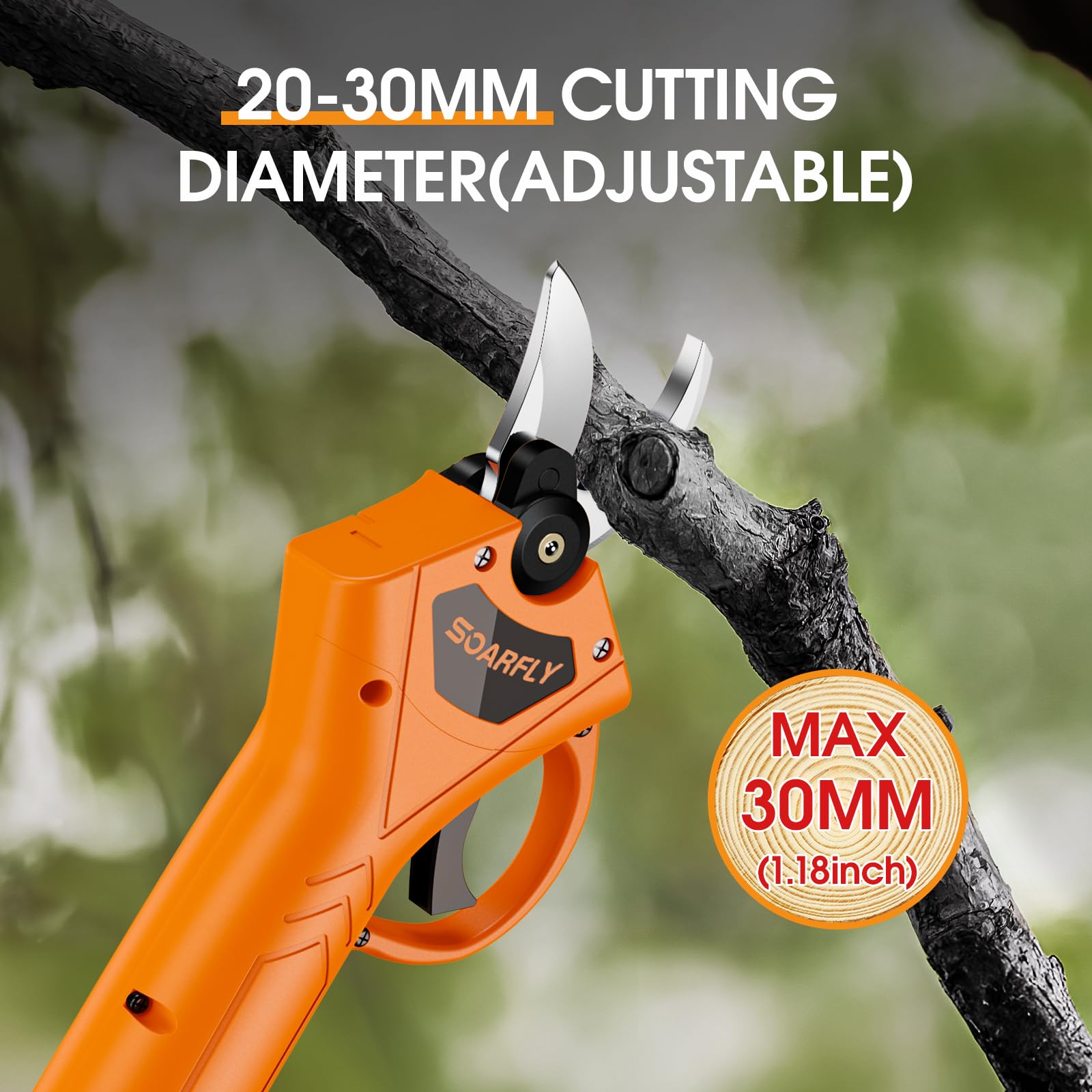 - Tamaño de corte ajustable: con un tamaño de corte ajustable con dos ajustes, estas tijeras de podar de batería pueden manejar ramas de hasta 35 mm de diámetro. Perfecto como cortador de ramas para jardines, parques, granjas, huertos e invernaderos.