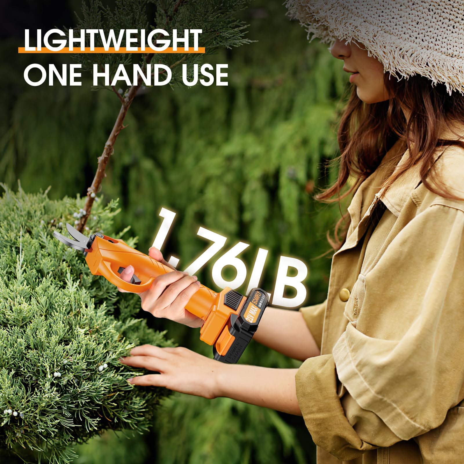 Tijeras de podar eléctricas, 35 mm, 1.4 pulgadas de diámetro de corte, podadora eléctrica profesional inalámbrica para cortar ramas de árboles, (2 baterías de 2000 mAh y 1 cargador incluido), naranja