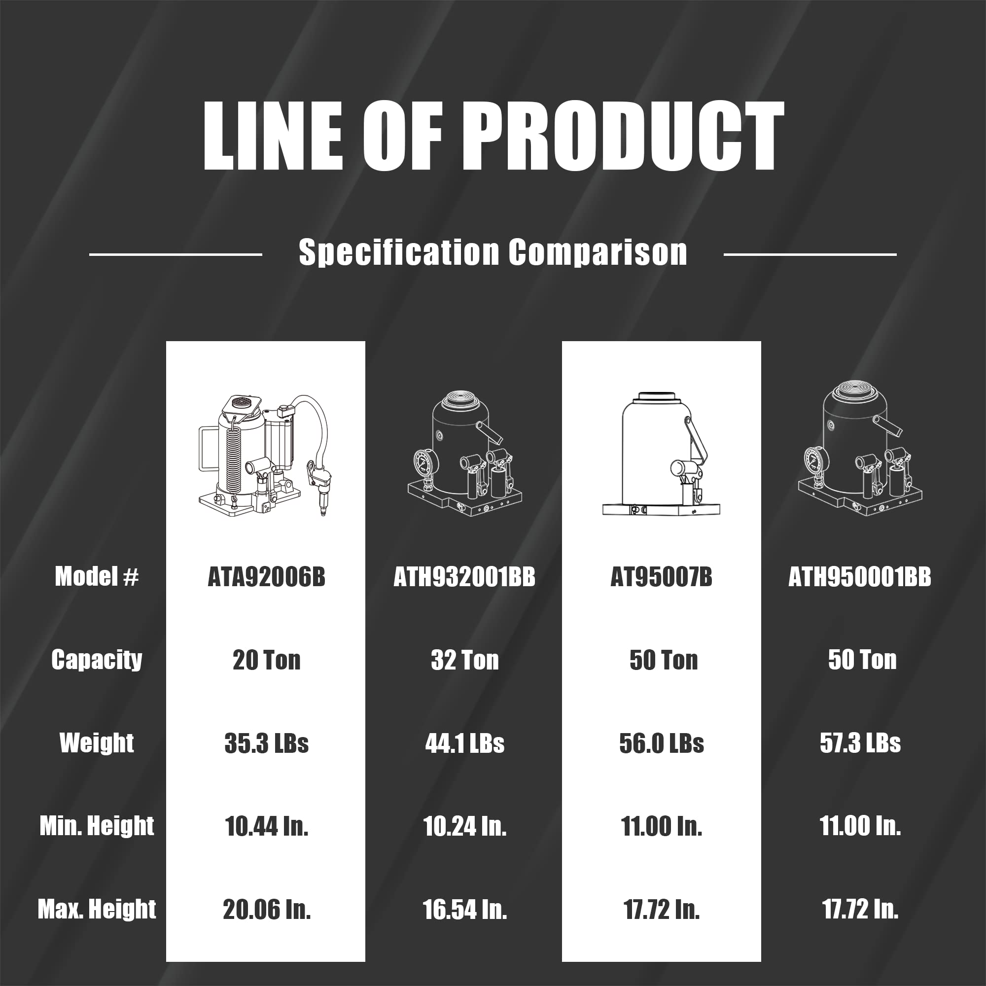 - Cuenta con un rango de elevación entre 10-7/16 pulgadas y 20-1/16 pulgadas con una capacidad de carga de 20 toneladas; diseñado para funcionar manualmente o neumáticamente