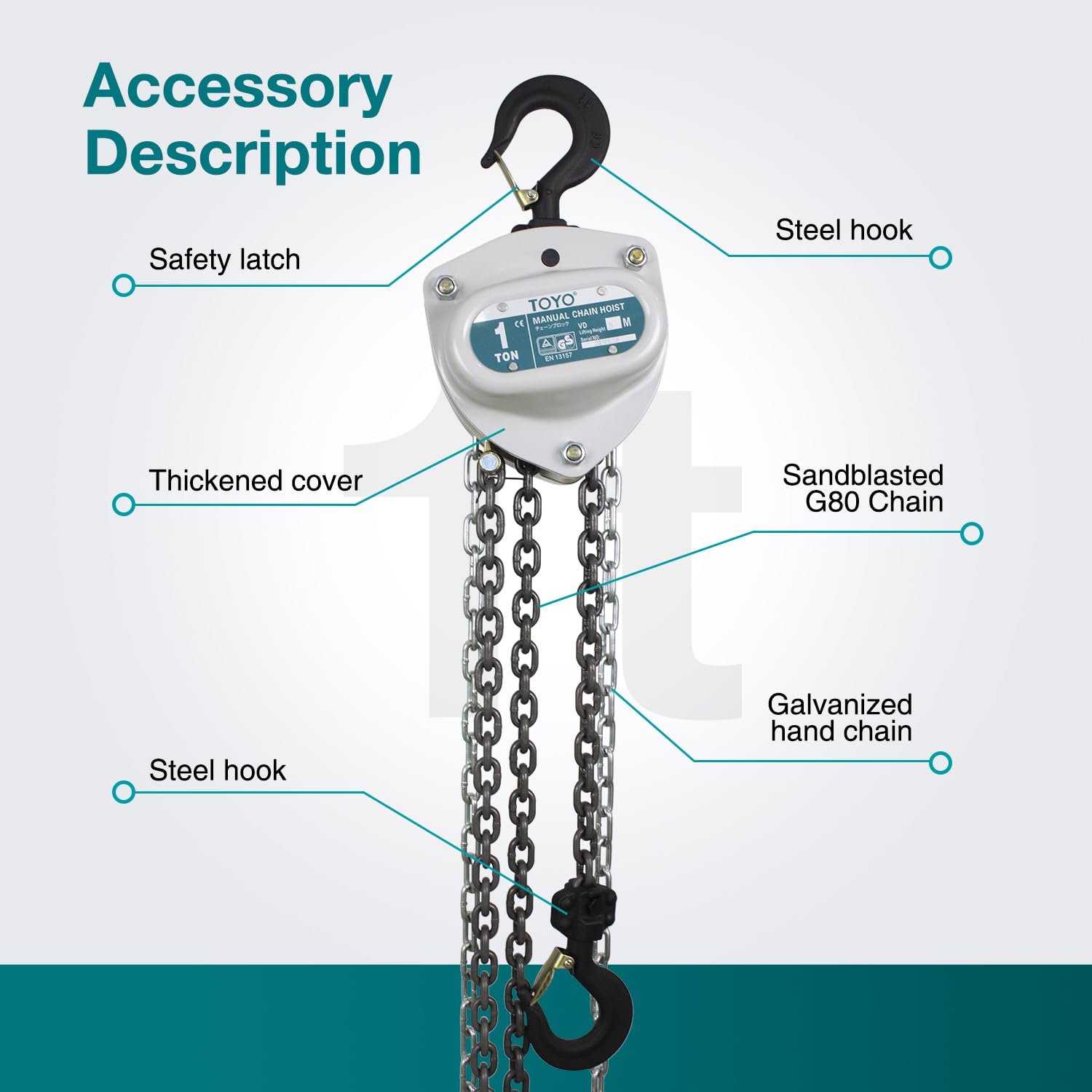 - Calidad confiable de Toyo: elevador de cadena de carraca con equipo y accesorios japoneses. Viene con certificación CE y GS.