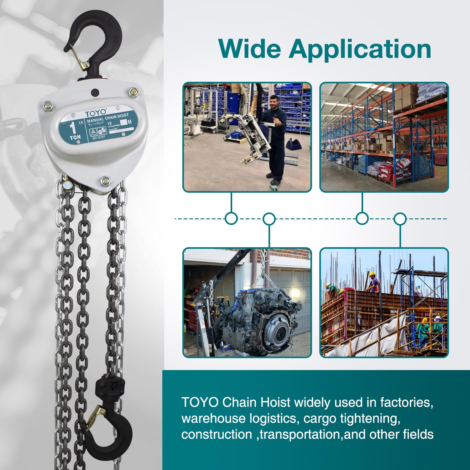 - Amplia aplicación: bloque de cadena TOYO ampliamente utilizado en áreas industriales, incluyendo fábricas, almacenes, granjas, garajes, construcción naval, transporte, obras de construcción, talleres y minas