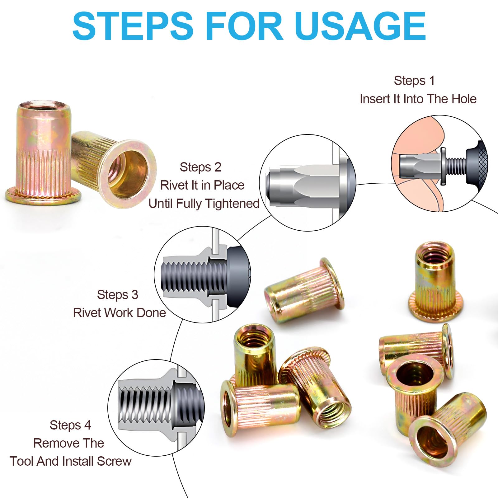 - Calidad duradera: la tuerca tiene una superficie endurecida que proporciona roscas de alta resistencia y carga. Utilizando la tecnología de fabricación más avanzada, la tuerca de remache tiene una superficie lisa y sin rebabas.