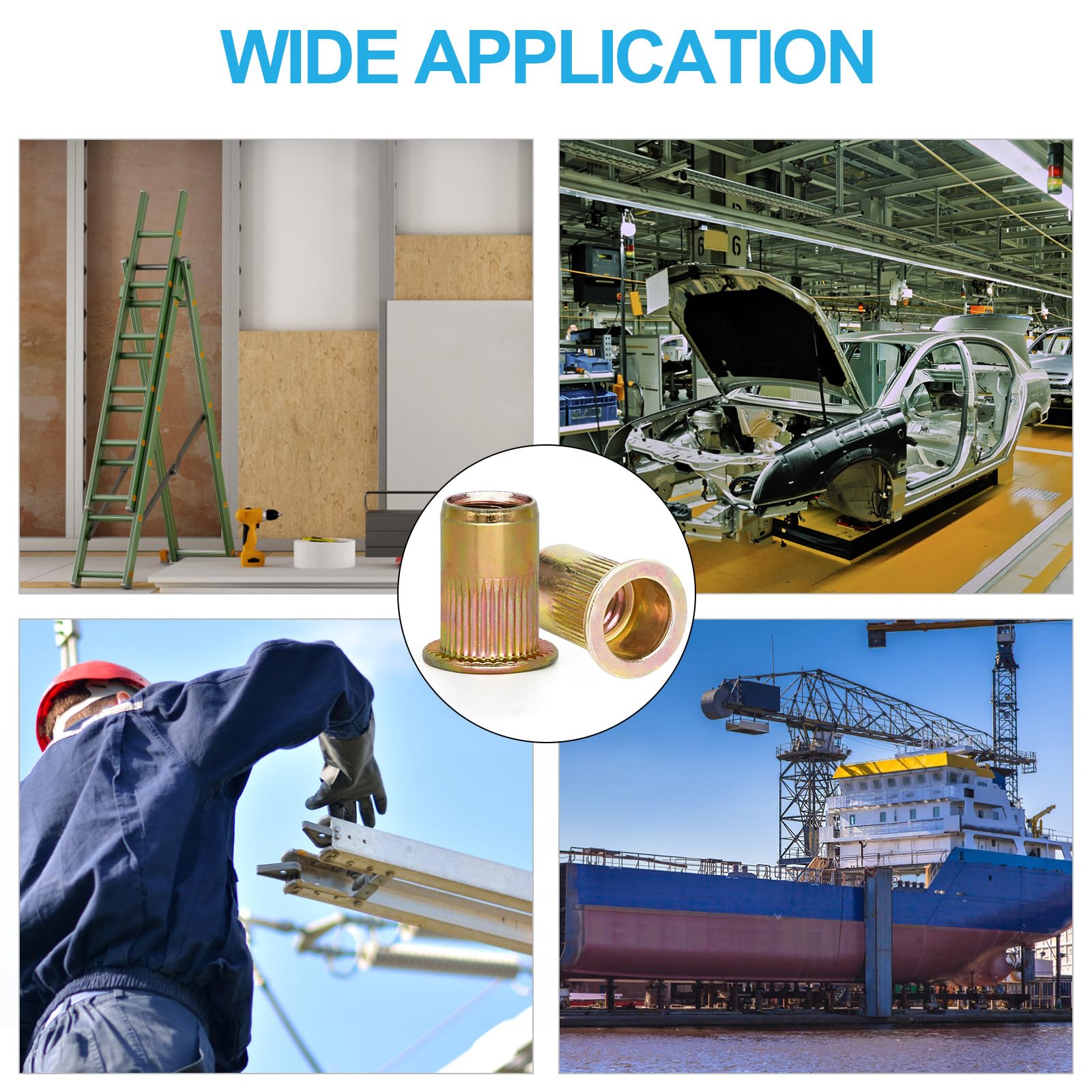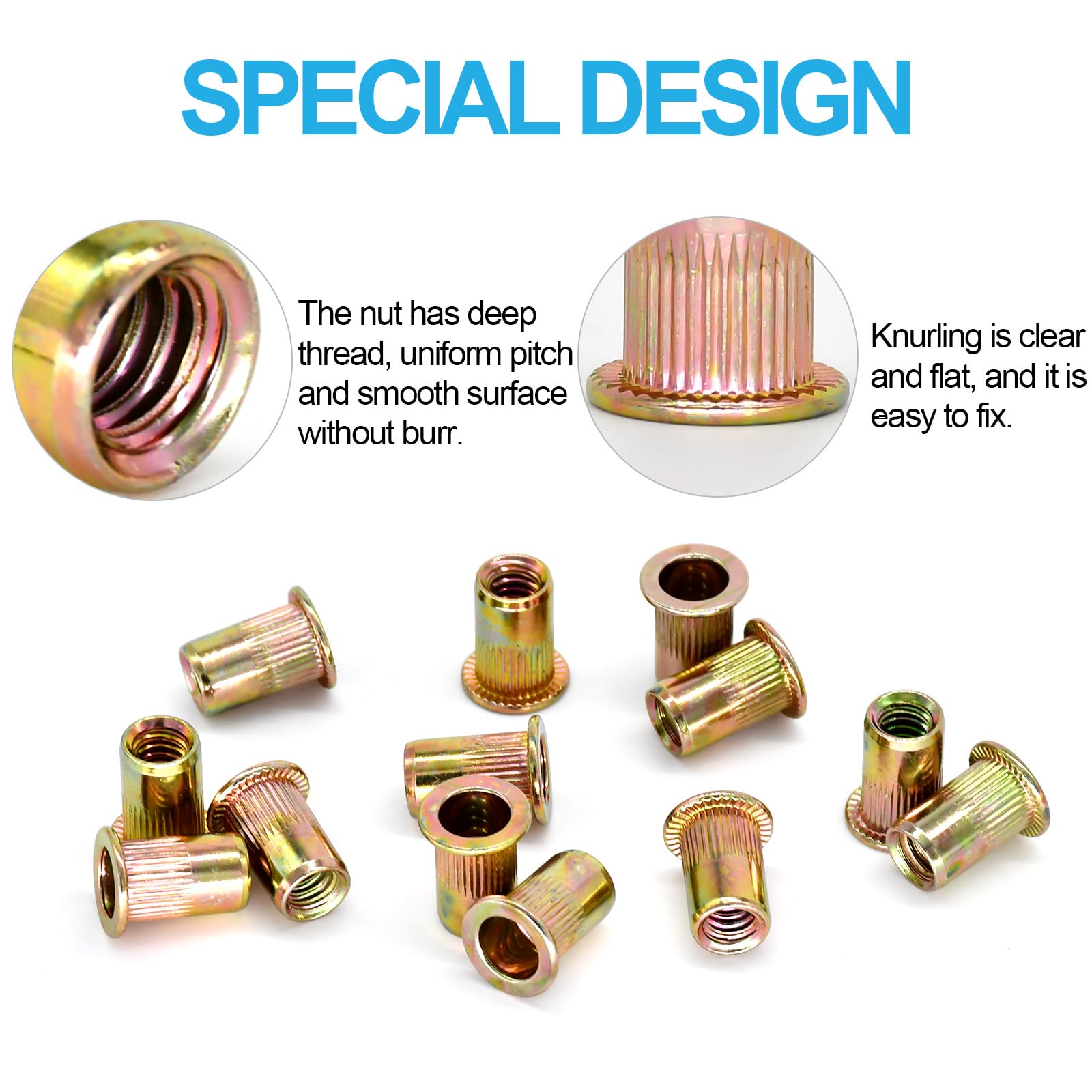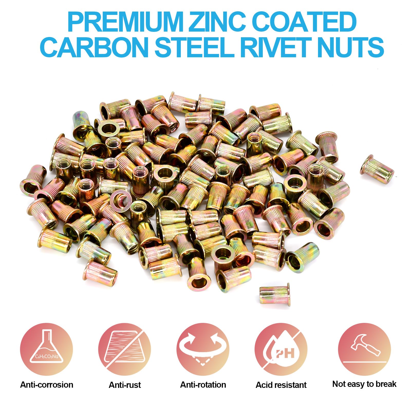 - Material de alta calidad: las tuercas de remache están hechas de acero al carbono, fuerte resistente al óxido y a la corrosión para un uso prolongado; la superficie chapada en zinc ayuda a prevenir daños en la superficie y la decoloración, antioxidantes, saludables y sin plomo, alta resistencia, no se deforman y las roscas de carga.