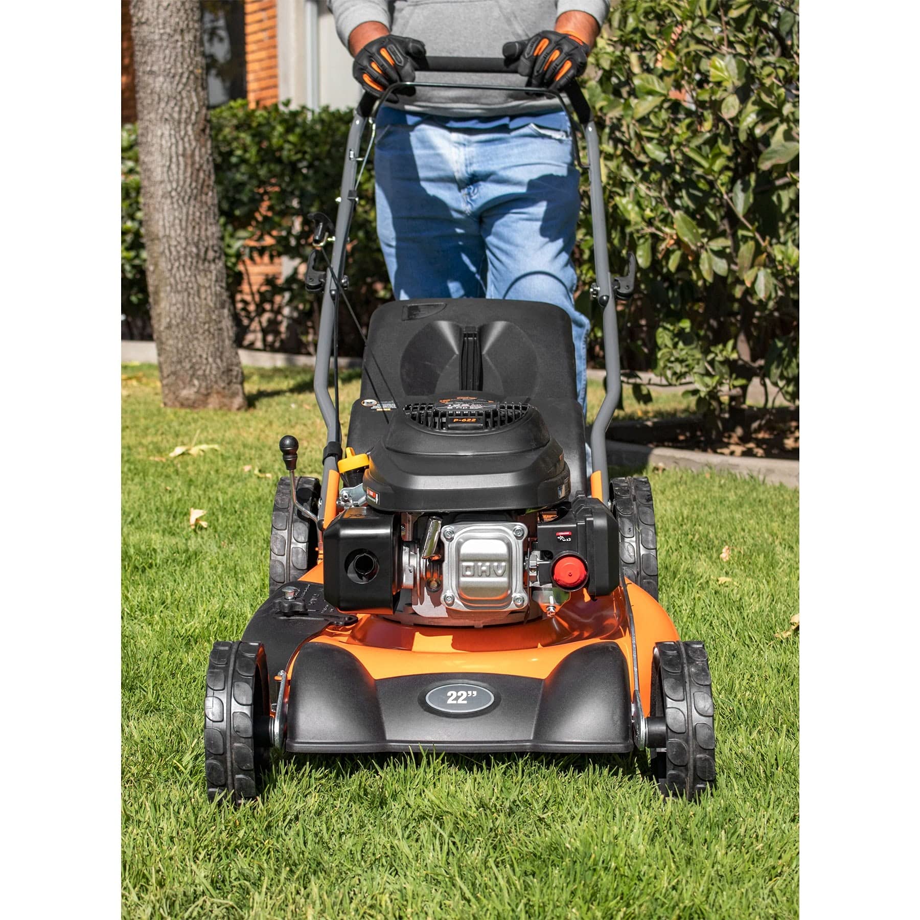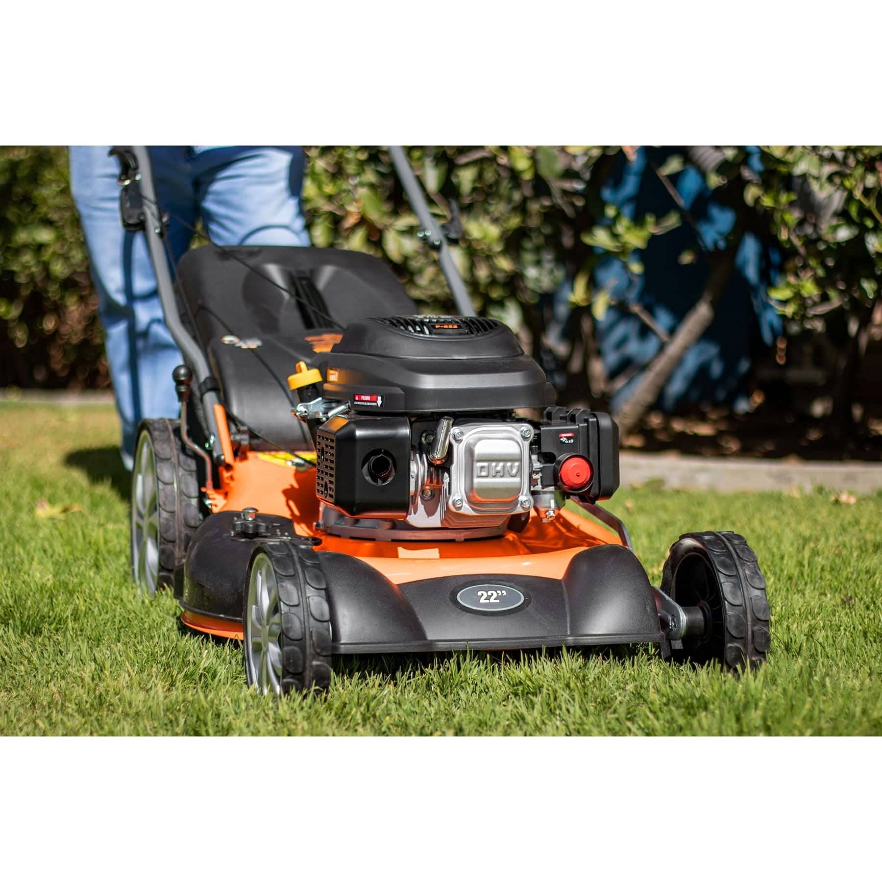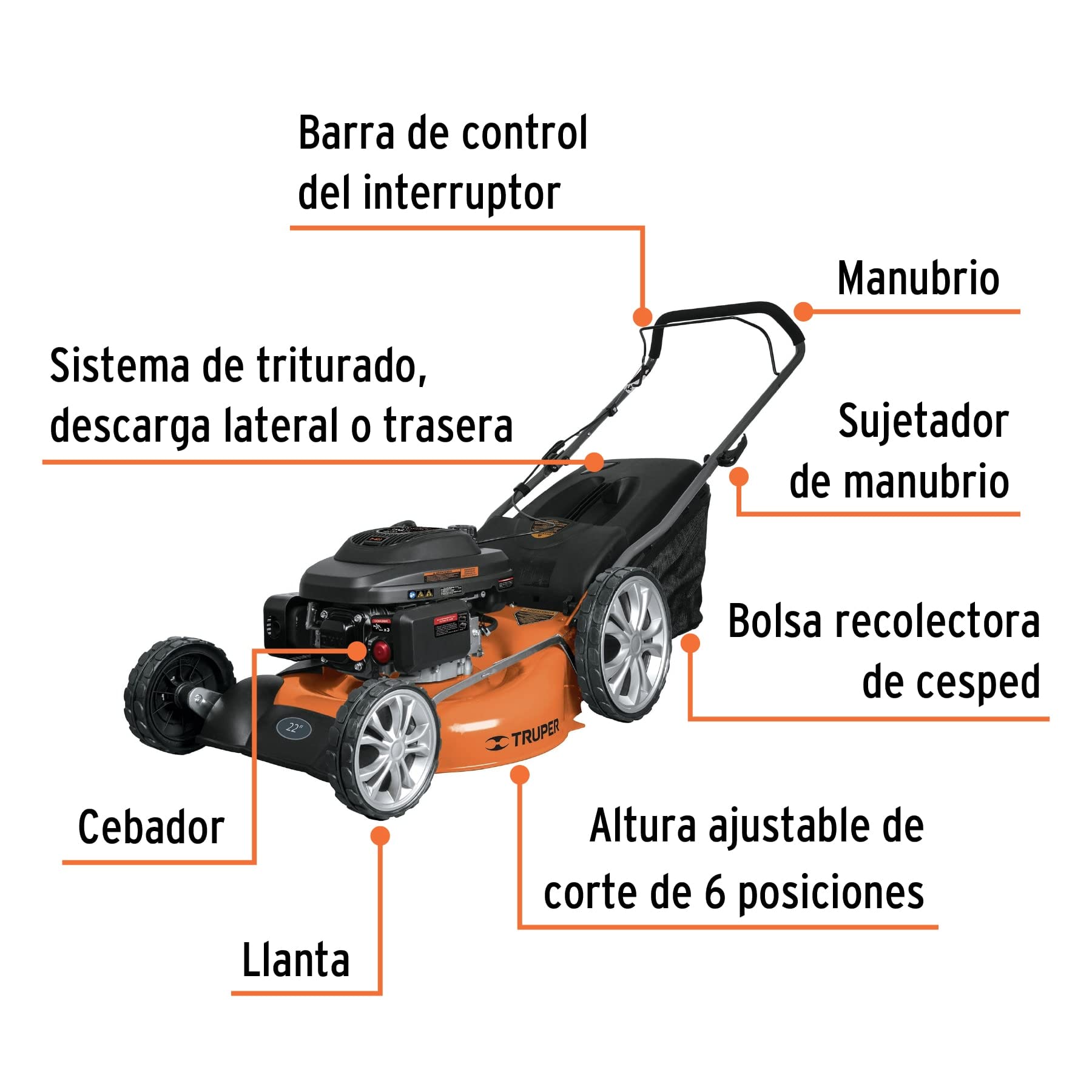 Detalles: Podadora con motor a gasolina con bolsa recolectora que incluye sistema de triturado, descarga lateral o trasera. Altura ajustable de corte de 6 posiciones con cuchilla de diseño aerodinámico. Sistema plegable para un mejor almacenamiento y transporte. Motor de fácil arranque, incluso en zonas de gran altitud o baja temperatura. Especificaciones: Motor a gasolina 196CC, potencia 6HP/4,474, capacidad del corte 22", capacidad del tanque 1L, peso 33.5kg, ciclo de trabajo 50 mins de descanso x tanque consumido, máximo diario, incluye aceite semi-sintético 473ml.