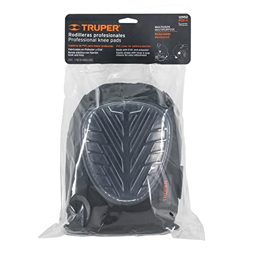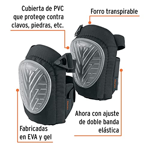 Detalles: Truper ROD-X, Rodilleras profesionales de PVC, ajustables, Rodilleras ajustables con banda elástica. Fabricadas en poliester y EVA (Etil-vinyl-acetato), Cubierta de PVC que protege contra clavos y piedras, Banda elástica con fijación hook and loop para mayor ajuste, Forro transpirable, Reforzadas, Multiusos, Longitud de correa 53 cm, longitud de rodillera 20.2 cm, ancho de rodillera 18 cm, peso por rodillera 210 g
