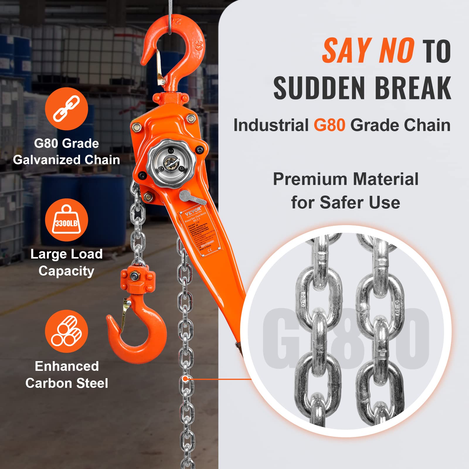 - Cadena G80 de alta calidad: la cadena de elevación está hecha de acero de manganeso galvanizado G80 y tiene alta resistencia y dureza. Cuando se trabaja en entornos agresivos, la capa galvanizada puede proporcionar resistencia a la corrosión.