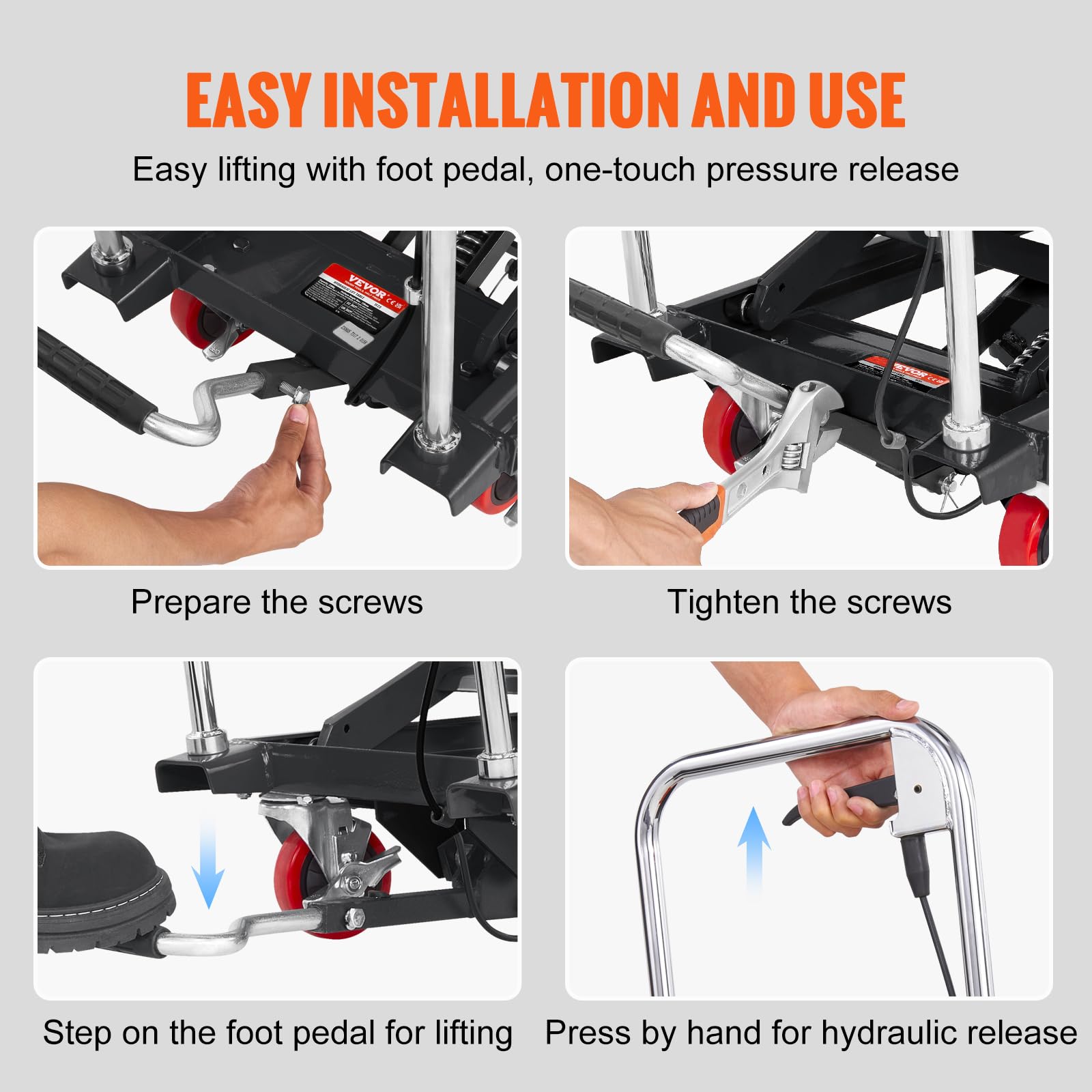 - Levantamiento sin esfuerzo: di adiós a las luchas de levantamiento pesado. Nuestra mesa de elevación de tijera individual cuenta con un diseño de pedal ancho, lo que permite un bombeo fácil y suave. La reducción se hace simple con la práctica palanca de liberación hidráulica, lo que te da un control total sobre la presión hidráulica.