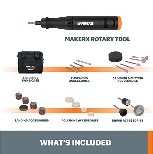 Detalles: Pequeño por diseño, todavía lleno de potencia. La herramienta giratoria Worx MAKERX con motor sin escobillas se adapta perfectamente a tu mano. Y sin una batería integrada, es más ligera, por lo que puedes trabajar durante más tiempo sin sentir la fatiga en tus brazos o hombros. Sin embargo, con un motor sin escobillas, aún obtendrá más que suficiente potencia para grabar y grabar, moler y lijar, cortar, pulir y limpiar. El control de velocidad variable te permite elegir la cantidad justa de jugo para el trabajo, por lo que para diferentes materiales y diferentes tipos de trabajo, puedes encontrar la velocidad que funciona para ti. Y está equipado con el tamaño de pinza más común de 1/8 pulgadas. Puede funcionar con todos los tamaños de pinza estándar, por lo que acepta las brocas y accesorios de todas las principales marcas. Pero este modelo viene con 20 accesorios, por lo que puedes empezar a trabajar desde el primer momento. Obtén la herramienta giratoria MAKERX y comienza a grabar vidrio, madera y metal. Corta los pernos sobresalientes, muele el óxido de los rieles de hierro antes de pintar, arena juguetes para niños o pule una placa de identificación de latón mientras todavía está montada. MAKERX ha creado herramientas de manualidades y pasatiempos que son más pequeñas, pero más potentes: el secreto reside en el Hub. Es una fuente de alimentación que puedes llevar con tu herramienta, por lo que si quieres trabajar en medio de un gran espacio, puedes y aún así tienes la potencia para hacer el trabajo. El diseño cuidadoso permitió a los ingenieros de Worx hacer estas herramientas más delgadas, para que puedas sostenerlas con más precisión y proporcionar un nivel de detalle a tus proyectos que no es posible con otras herramientas. Este modelo no viene con el MAKERX Hub o una batería Power Share de 20 V, pero eso es por diseño. Porque si ya tienes un Hub y una batería, no hay necesidad de volver a comprarlo. Es una gran manera de ahorrar dinero mientras construyes tu colección de herramientas MAKERX. Si estás buscando un kit completo con batería, cargador y concentrador de energía, considera el kit WX739L.