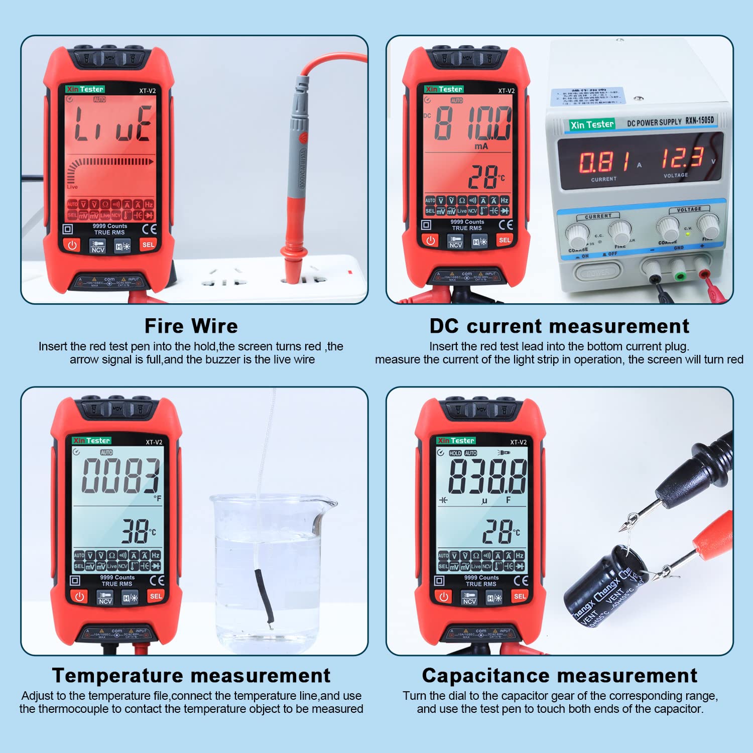 - 【9999 Recuentos】 9999 Rango automático, medición de alta precisión de varios datos, el valor dentro de 9999 se puede mostrar con 4 dígitos. Haga de este multímetro digital el mejor ayudante para pruebas eléctricas.