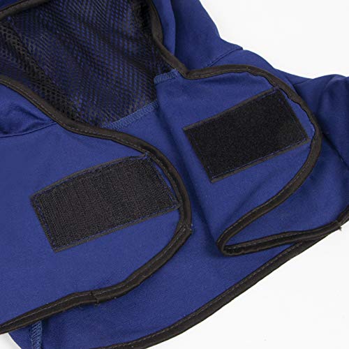 Detalles: Especificaciones: Material: tela ignífuga, forro de malla de algodón, correas de velcro. Color: azul. Tamaño: talla única (se adapta a todos). Circunferencia de la cabeza: 41 cm. Cuello: 15 cm. Aplicación: Se aplica en soldadura, corte y otros lugares de trabajo seguros, adecuado para trabajos físicos pesados secos y protección de cabeza/cuello de soldadura.