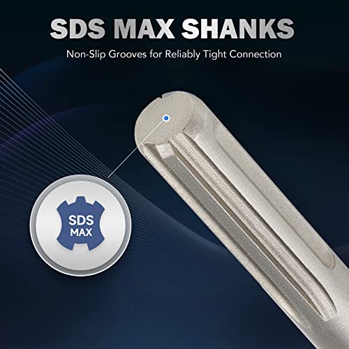 - Vástagos SDS MAX: estas brocas encajan perfectamente en tu taladro de martillo SDS Max independientemente del fabricante, compatible con Bosch, DeWalt, Makita, Milwaukee, Hilti o cualquier otro; cambia cada broca rápidamente para manejar diferentes trabajos de demolición